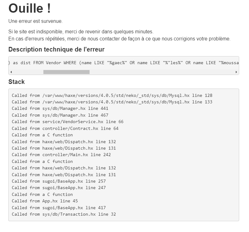 | Description | CATALOGUES / CHERCHER UN PRODUCTEUR Lorsque l'on utilise des guillemets dans le nom du producteur ou de la ferme , erreur non catchée | ||||