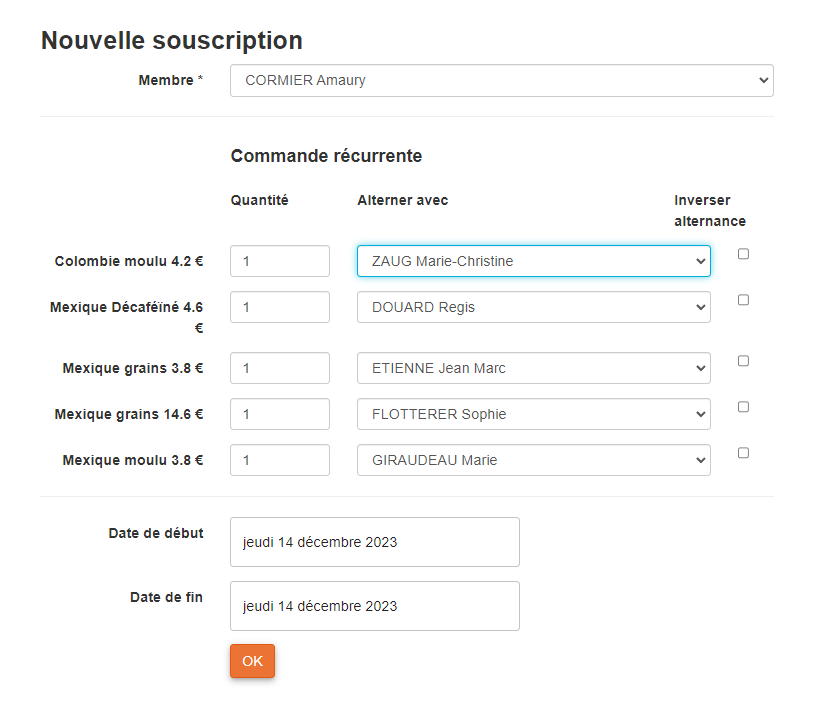 En fait si on ne peut pas sélectionner plus d'1 membre comme "alternant" on peut modifier l'alternance pour chaque produit. Cela peut permettre d'avoir un contrat 1 grand panier / 1 petit panier alterné avec inversion d'alternance sur un des deux, ce qui aboutit à alterner 1 petit et 1 grand panier pour les membres. Cela a donc son utilité. Il faudrait cependant n'avoir qu'une boite de sélection du membre alternant et garder la coche d'inversion pour chaque produit |