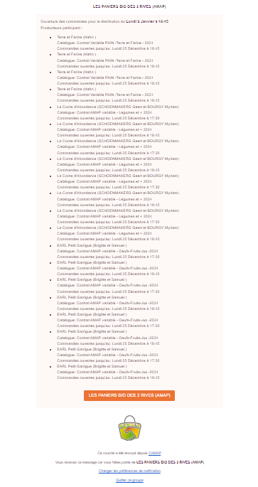 | Description | les notifications pour ouverture de commandes se présentent bizarrement depuis quelques mois (septembre ou octobre) : Les catalogues apparaissent chacun 4 fois (voir PJ). Pour info, dans notre Amap, nous ouvrons les commandes le mois précédent pour le mois suivant avec une distribution par semaine. Ce n'est pas grave mais c'est un peu perturbant pour les adhérents et ce n'était pas comme cela avant. | ||||