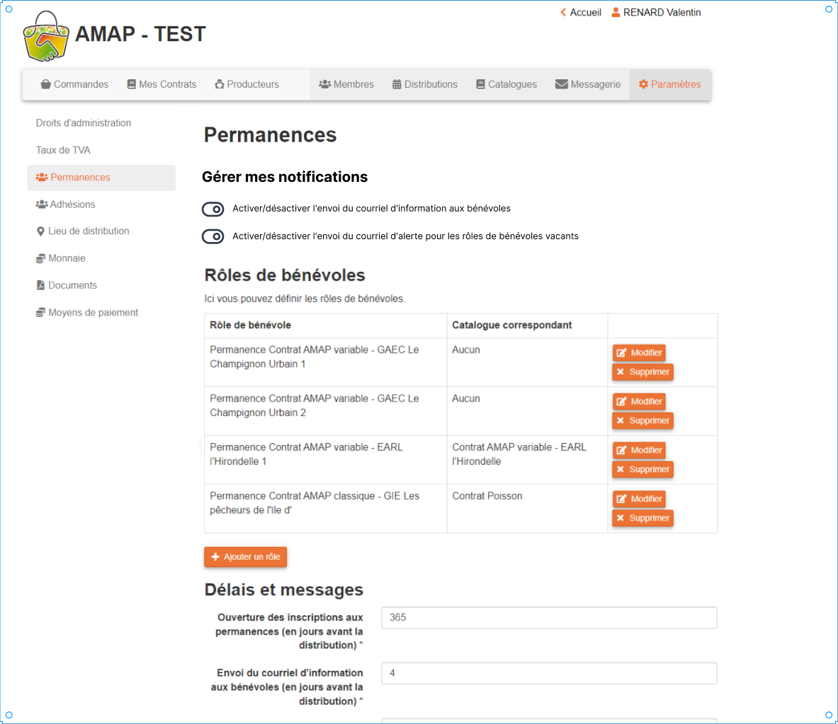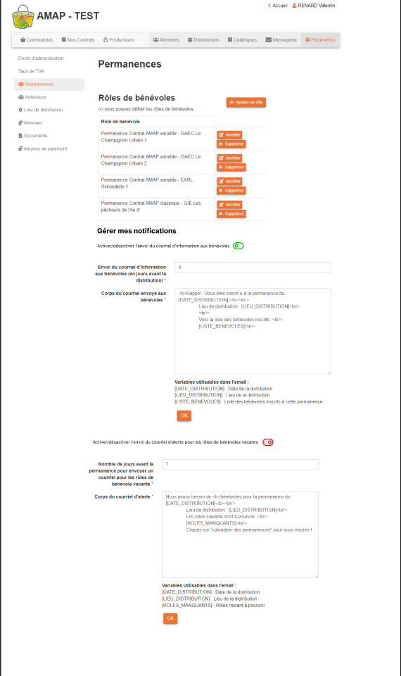 Seulement l'administrateur peut-il gérer les notifications emails ? OUI Est-ce que ça ne vaudrait pas le coup de créer une section "Notifications" dans la partie Paramètres pour regrouper l'ensemble de la gestion des notifications dans cette partie ? NON Préférer une gestion des notifications par page ici les permanences Si possible mettre les boutons à la hauteur de chaque notification (voir les 2 screnshot : si le bouton est activé, ouvrir la fenêtre pour saisir le nombre de jours |