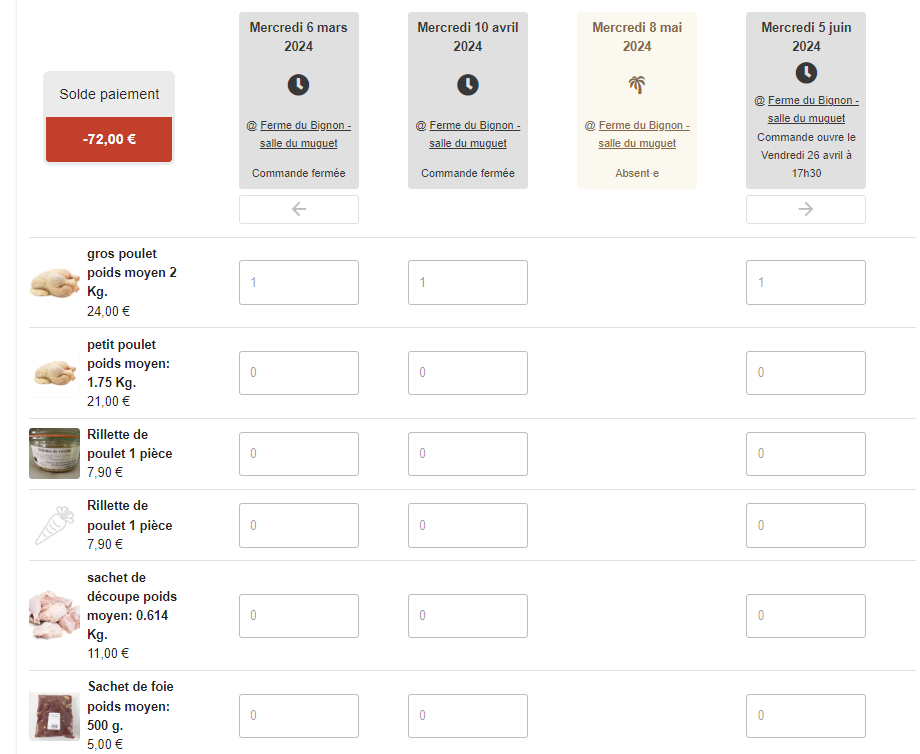| Description | Permettre la saisie par un coordinateur des commandes de contrats variables sur un même écran pour plusieurs dates. L'écran pourrait être le même que l'écran de saisie utilisateur pour les contrats variables, avec une boite déroulante de sélection du membre concerné. Si une commande existe déjà elle est affichée (comme sur l'écran de saisie utilisateur) Accès via bouton "Saisie en masse des commandes" au dessus du tableau des commandes à venir (Contrairement à l'écran utilisateur le coordinateur peut saisir toutes les commandes ouvertes ou non pour toutes les dates de distribution prévues au catalogue) | ||||