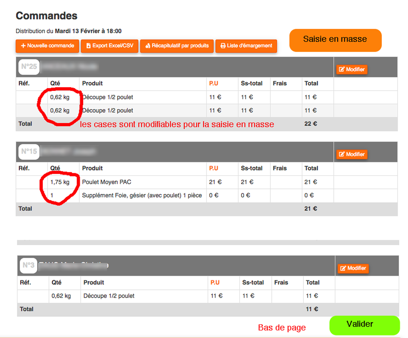 | Description | Pouvoir saisir en masse tous les poids (quantités) dans une commande (équivalent à la fonction "Saisie de paiements en masse" dans Catalogues/ Gérer / Souscriptions). | ||||