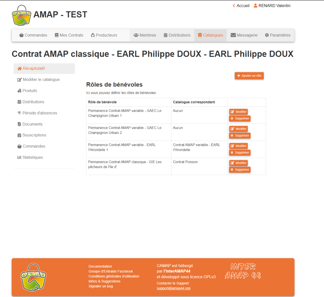 Dans ce nouvel écran "Permanences" associé à chaque catalogue, mettre le bouton "Ajouter un rôle" (cf Paramètres/Permanences) En dessous un tableau avec la liste des roles existant + boutons modifier et supprimer pour chaque rôle Dans le cas d'une duplication du catalogue, les rôles sont recopiés par défaut A chaque date à laquelle le catalogue participe (sous menu Catalogue / Distributions) les permanences doivent être activées En cas de report d'une date de distribution, les permanences associées doivent suivrent le report de date distribution En cas d'annulation d'une date de distribution les permanences doivent être supprimées Dans l'écran PARAMETRES / PERMANENCES, création des rôles de permanence indépendant d'un catalogue uniquement (on ne peut plus lier un catalogue à un rôle de permanence). Pour chaque rôle de permanence ajouter une case à cocher "activer par défaut" qui détermine si le role doit être activé ou non à chaque date de distribution de l'AMAP | ||||