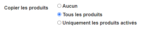 Ce n'est pas un bug mais le comportement voulu: on ne recopie que les produits utilisés, cela permet d'épurer les catalogues lors de la copie A discuter: est-ce souhaitable de modifier ce fonctionnement ? Le rapporteur peut s'éviter la réactivation/désactivation des produits lors de la copie en faisant un simple export/import sans édition du fichier Avec la version 1.2.0 (gestion des stocks) la gestion des produits disponibles par distribution pourra se faire via les stocks par distribution |