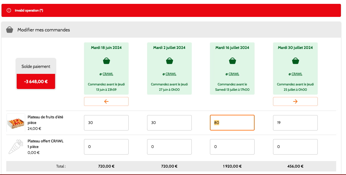 | Description | Quand la gestion de stock est activée, le mangeur qui passe commande a l'information du stock restant. exemple actuellement il passe commande pour 5 produits mais il n'en reste que 3 en stock, un bandeau rouge s'affiche et indique le nombre de produits disponibles Mais dans la nouvelle version, ne s'affiche que Invalid… | ||||