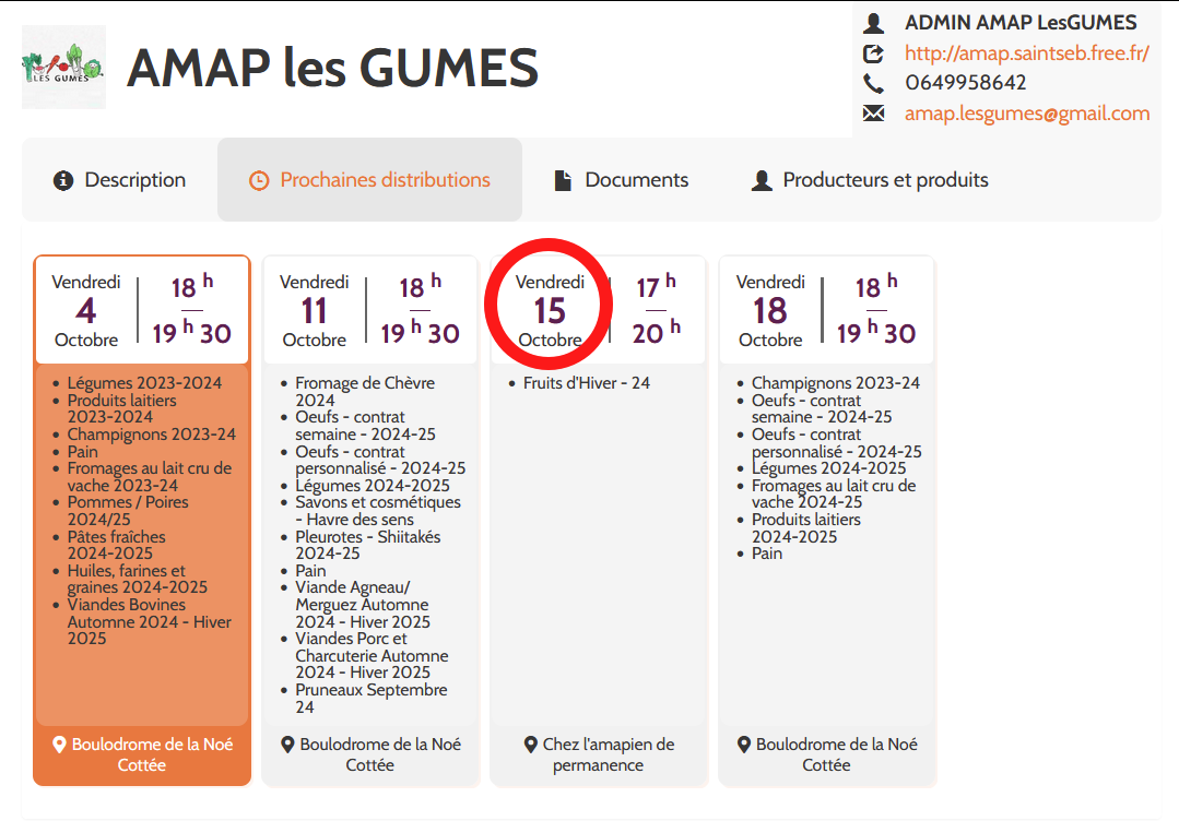 | Description | Une distribution est prévue le MARDI 15 octobre pour l'AMAP de St Sébastien sur Loire sur la page publique le jour de la semaine affichée est VENDREDI 15 octobre ! ci joint capture d'écran | ||||