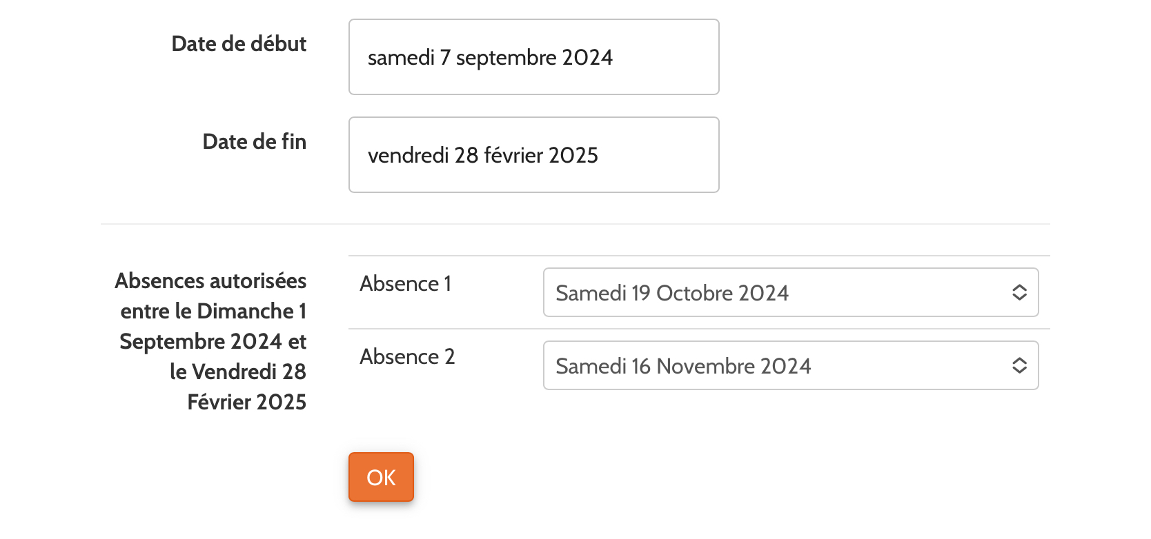 | Description | Si une des dates d'absences listées est passée, on ne peut plus modifier aucune date d'absence. | ||||
