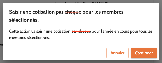 | Description | au moment de la saisie pour un ou plusieurs amapiens, dans l’écran s'affiche : Saisir une cotisation par chèque pour l'année en cours pour tous les membres sélectionnés Cette action va saisir une cotisation par chèque pour l'année en cours pour tous les membres sélectionnés Désormais on propose le paiement par chèque et aussi par virement. Version corrigée : Saisir une cotisation pour l'année en cours pour tous les membres sélectionnés Cette action va saisir une cotisation pour l'année en cours pour tous les membres sélectionnés. | ||||