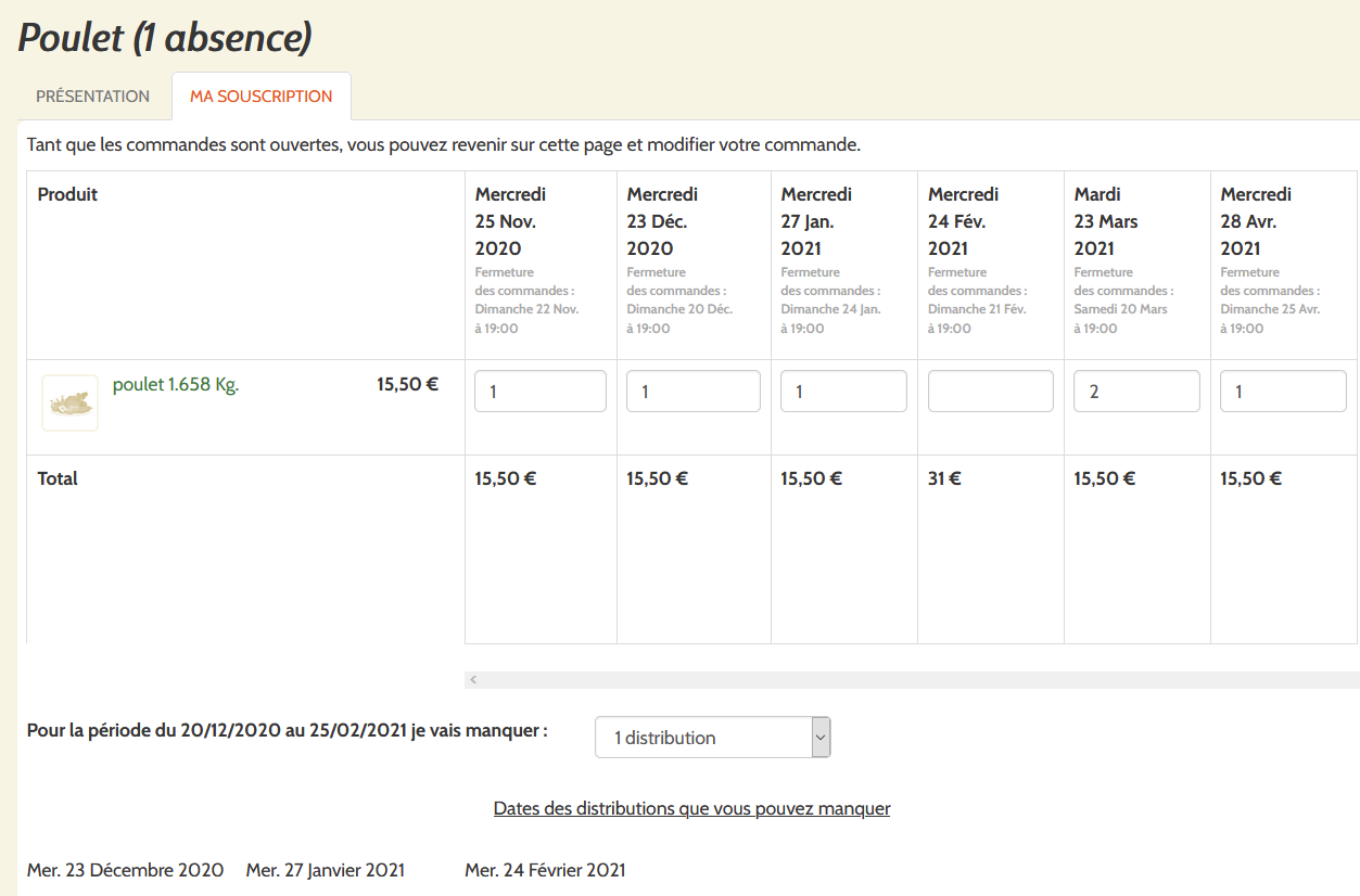 | Description | Patrice HUREL2 oct 2020 Toujours sur le compte "AMAP de l'inter TEST" je souscris au contrat poulet(1 absence) voir la capture dans un premier temps cagette ne me demande pas la date de mon absence ( 24 février) donc je saisis les commandes pour toutes autres dates et je mets rien au 24 février et je précise que je vais manquer 1 distribution (voir capture) résultat: cagette supprime la première date des absences que je n'ai pas choisis (voir capture) et seulement après je peux choisir la date d'absence (24 février) conclusion il faudrait d'abord un onglet pour choisir la ou les dates d'absences avant d'arriver à l'onglet des commandes | ||||